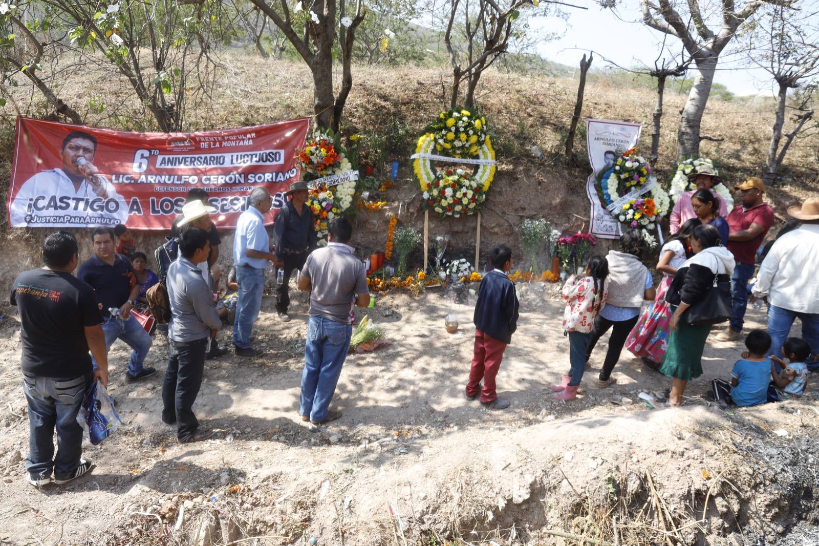 Nota Informativa Arnulfo: tu lucha sigue en la Montaña En memoria del defensor Arnulfo Cerón Soriano, desaparecido el 11 de octubre de 2019, su mamá Rosalía, el Frente Popular de la Montaña (FPM), autoridades comunitarias, pobladores de la colonia Nueva Esperanza, El Mirador y Zacualpan, municipio de Tlapa, con el copal y veladoras colocaron una ofrenda floral donde fue encontrado y en el panteón donde yacen sus restos a seis años del artero crimen este 20 de noviembre de 2025. A las 10 de la mañana más de 50 personas estaban en los Tres Postes de la colonia el Ahuaje, donde encontraron a Arnulfo a tres metros bajo tierra. Los que seguían llegando encendieron las veladoras y pasaron a dejar sus flores. Dibujaban la cruz en sus rostros para encomendarse al abogado y defensor para que los ayude, decían. Rosalía, madre del defensor, con las lágrimas en el rostro dejaba correr sus pensamientos… Con la palabra sagrada de los abuelos y abuelas el rezandero con la mirada de frente le habló a Arnulfo. Sus cánticos religiosos, los rezos y el humo del copal, las luz de las veladoras y el aroma de las flores creaban un ambiente sombrío, pero también de esperanza. Los sentipensares se condensaban en la leyenda de los arreglos florales que se sostenían de un paredón: “San Miguel Amoltepec el Viejo. Arnulfo Cerón Soriano”, “sexto aniversario luctuoso de Arnulfo Cerón Soriano” y “Arnulfo: tu lucha sigue en la Montaña”. A las 11 de la mañana inició el rezandero Nicolás, originario de Zacualpan del municipio de Tlapa. El primer misterio, segundo, tercero… acompañado de cánticos como una melancolía surcando los aires. “Lleva Dios mi alma cuando de mi cuerpo salga”, el canto. Combinó los rezos en español y en latín. Después de que terminaron los rezos, integrantes del Frente Popular de la Montaña dieron espacio para Abel Barrera Hernández, director del Centro de Derechos Humanos de la Montaña Tlachinollan, donde llamó a redoblar esfuerzos porque los gobiernos no están atendiendo los reclamos de las comunidades. Lo peor es que no están respetando la lucha de las organizaciones sociales y de los defensores comunitarios como Arnulfo. “En lugar de honrar a las víctimas de la violencia, a quienes han luchado, a quienes han muerto y asesinado como Arnulfo, el gobierno de Guerrero está haciendo honores a quienes cometieron crímenes como Rubén Figueroa. Aquí en Tlapa mandó reprimir a los maestros y maestras cuando estaban exigiendo mejorar su salario”. Arnulfo se forjó de acero desde que asesinaron a su papá y a su hermano, cuando era un niño. Con dificultades se fue a estudiar a Chilpancingo, con el apoyo de su hermana salió adelante. Se convirtió en abogado. Estuvo en Tlachinollan y luego empezó a defender a los pueblos pobres. Su historia lo llevó a incursionar en la lucha social. Defendió a los papás y mamás de los 43 jóvenes que siguen desaparecidos con Antonio Vivar, un joven estudiante, tomaron las calles, protestaron. Arnulfo nunca descansó. Tuvo que buscar cómo sostener a su familia y ayudar a su mamá. Nunca olvidó sus raíces, siempre estuvo con el corazón puesto para ayudar a la gente y por eso le hicieron daño. Arnulfo defendió el derecho de los pueblos indígenas hasta las últimas consecuencias. Las autoridades le advirtieron que ya no siguiera reclamando, pero no se arredró. “La noche del 11 de octubre de 2019 lo sacaron de su casa a engaños y lo entregaron. Esa misma noche lo mataron. No esperaron porque lo querían muerto. Se lo llevaron a una casa, por Contlalco. Lo estuvieron torturando, amenazando, golpeando hasta que lo mataron. Aquí lo vinieron a dejar a casi tres metros de profundidad para que nadie supiera dónde estaba. Aquí era una calle, pensaban hacer negocios los delincuentes, vender terrenos. Pensaron que nadie se iba a dar cuenta del paradero de Arnulfo, pero la decisión de sus compañeros del Frente, de Tlachinollan, fue no dejar a Arnulfo, porque si no lo anduviéramos buscando sin saber dónde lo dejaron. “Más de 130 mil personas que están desaparecidas en México, entre las que estuvo Arnulfo, pero con la organización comunitaria no lo dejamos, no corrimos, no nos escondimos, al contrario, salimos al frente y tuvimos que decirle al gobierno: ustedes son los responsables de lo que le pasó a Arnulfo. “Venimos a honrar a Arnulfo, y reconocer su trayectoria. Aquí lo venimos a sacar. Lo quisieron enterrar, pero no saben que sembraron su semilla. Por eso estas flores, estas velas, porque él vive en nuestro corazón, en nuestra lucha. Arnulfo, porque sabemos que tú, donde estés, vas a seguir apoyándonos. Vas a seguir viendo por tu familia, por tu mamá que sigue firme, por tu familia que no está acá porque no fue fácil enfrentar esta situación, hubo amenazas porque estaban sueltos los delincuentes y siguen algunos. Afortunadamente por la lucha que hemos dado seis personas se encuentran en la cárcel, cuatro de ellos son los que fueron a traer a Arnulfo. Cuatro están sentenciados a más de 50 años. Ahorita sigue en proceso uno más. Luchamos para que también se castigara al autor intelectual, pero la justicia en Guerrero todavía no llega para los pobres. Seis años del asesinato de Arnulfo no han sido en vano porque la lucha del Frente Popular de la Montaña sigue. Han logrado obligar a que la autoridad reconozca los derechos de las comunidades, y tengan obras, carreteras, clínicas, medicamentos y escuelas. Hagamos esta causa común para que Arnulfo siga viviendo en esta Montaña, como él lo soñó. Que las familias tengan lo digno para poder vivir, trabajo, educación, créditos, apoyos para el campo, apoyo para las mujeres, apoyo para los niños, obra pública, todo para que haya justicia en las comunidades. ¡Viva Arnulfo!” Regino invitó a todas las personas a la tumba de Arnulfo a la comunidad de Tlaquiltepec porque “no era cualquiera porque entregó su vida por lo